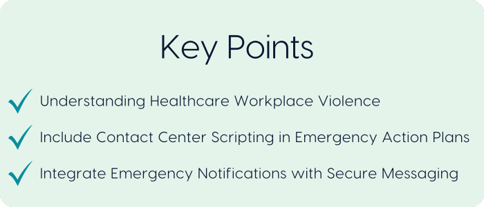 Technology used by a healthcare organization’s contact center should be included in a violence prevention program. As the hub of communication for a hospital system, their call center already has updated contact information for departments and employees and uses highly effective communication tools to get critical alerts to staff members.