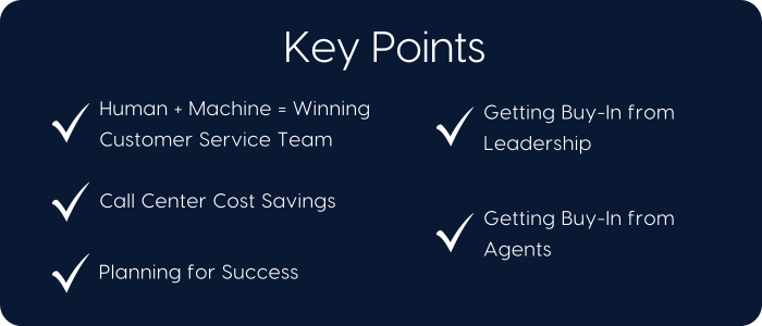 Call center managers can overcome objections leadership may have about the cost and disruption of implementing AI and LLMs by focusing on the long-term ROI (return on investment). Work with your accounting office to present a clear picture of the long-term cost savings AI and LLMs can bring.