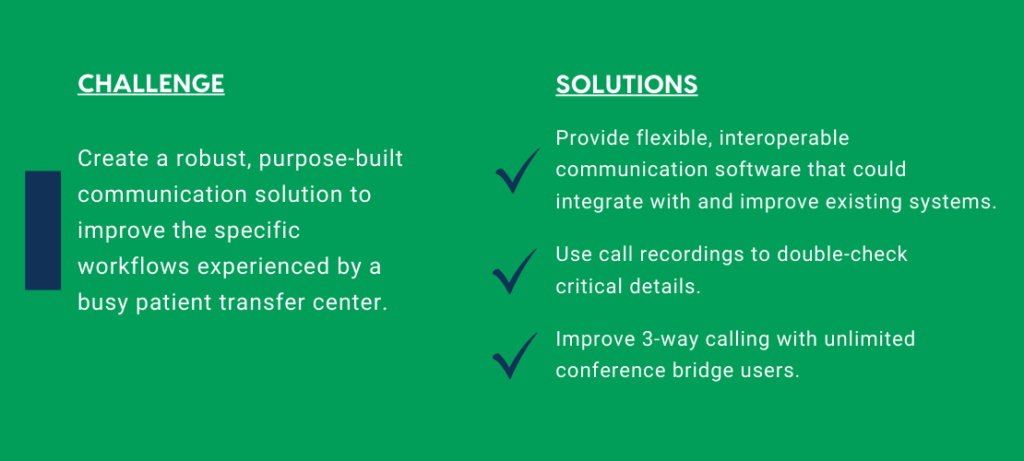 Patient transfer centers provide a time-sensitive service. Coordinators work 24/7 to help patients and hospitals. One patient transfer request can easily turn into 10-15 different calls for the transfer coordinator, especially if a patient becomes emergent or needs multiple specialists.