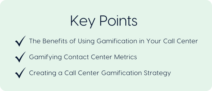 Creating a strategy for your contact center’s use of gamification will guide decision-making and ensure the original focus(es) aren’t lost over time.