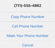 To dial from the Amtelco Secure Messages app on iOS, tap the number to dial or copy it. The phone number menu will display if the Group is configured for the Option Dialing Mode. To dial direct, select “Call Phone Number.” To route the call through your call center or organization and have their number shown on the Caller ID, select “Mask Your Phone Number.”