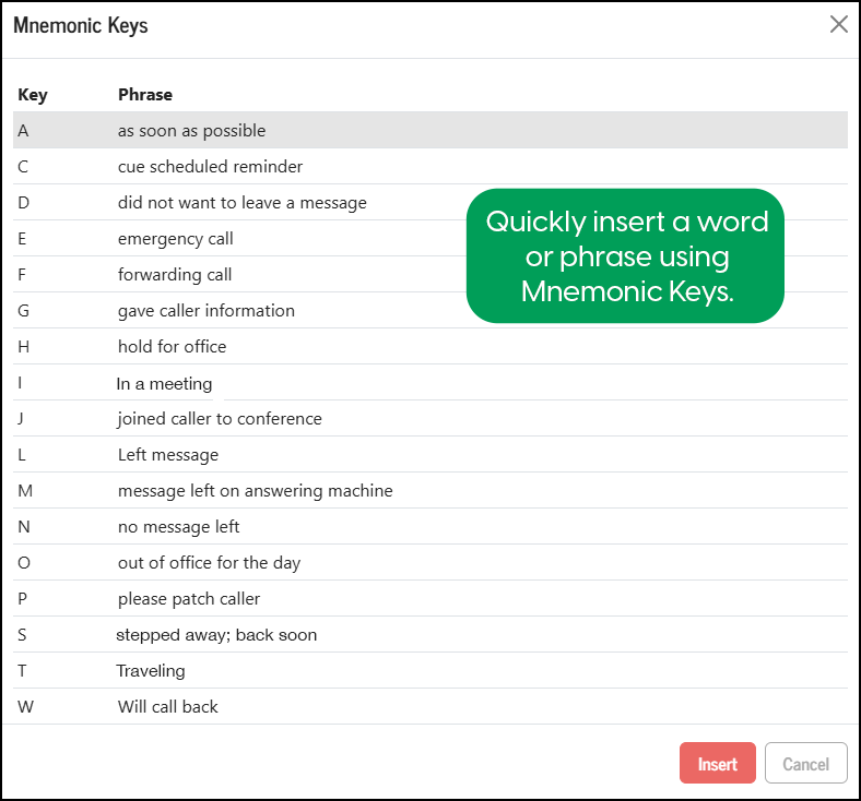 As many as 26 mnemonic keys are available, with one for each letter A through Z. Supervisors enter the list of custom phrases, typically making them easy for operators to remember, such as using W for will call back and H for hold for office, for example. Operators can easily bring up the complete list of mnemonic key phrases and select one to quickly enter it.