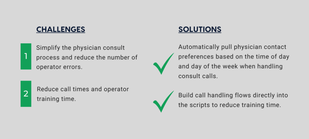 One of the most significant benefits scripting brings to the hospital call center is the reduced training time for operators. Before scripting, training a new operator involved explaining how each type of call needed to be handled and any special requirements for some of the physicians. This process could take up to a month for new operators to become familiar with all the details.