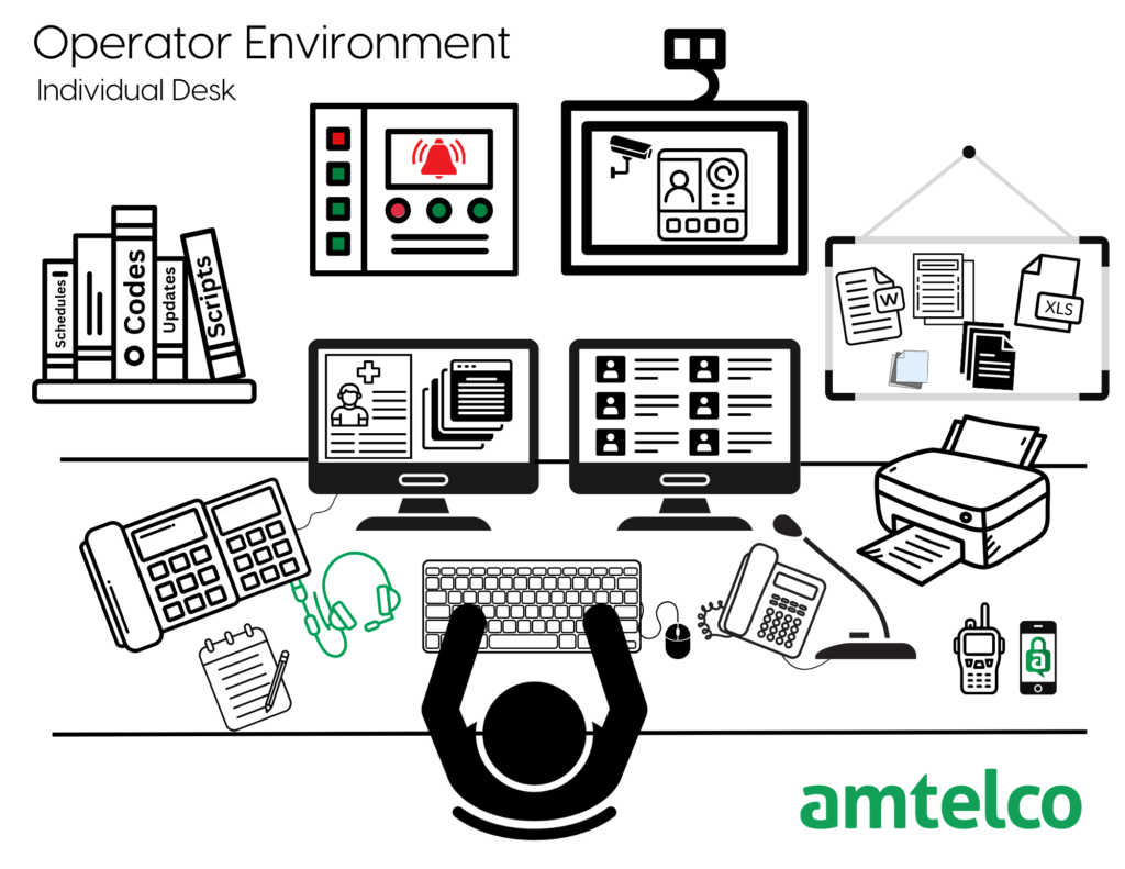 Agents also monitor alarms for building systems (fire, fridge, air conditioning, etc.) and various medical equipment. Often, this equipment is mounted on the wall with no integration to the operator console, and each features its own interface display and notification method. SMS, paging, radio telephones, and overheads are typically in their own separate area away from the operator workstation.